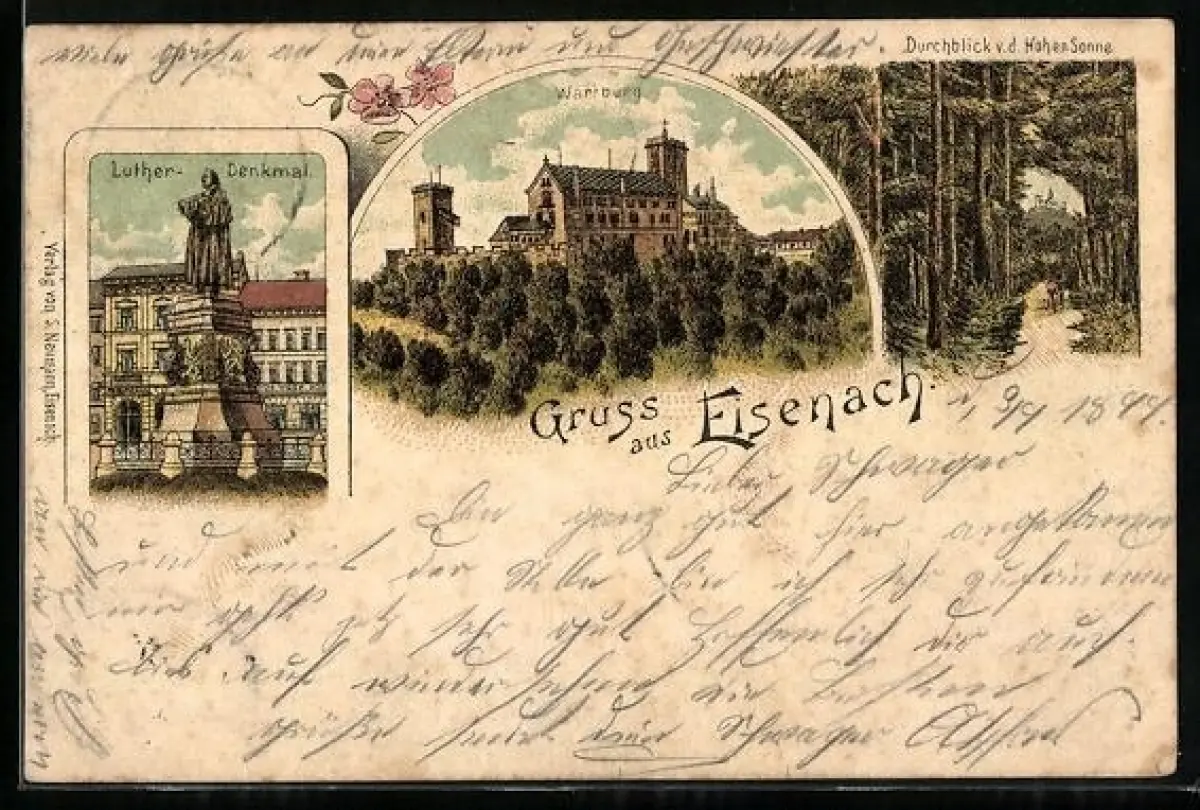 Lithographie Eisenach, Wartburg mit Luther-Denkmal und Durchblick v. d. Hohen Sonne
