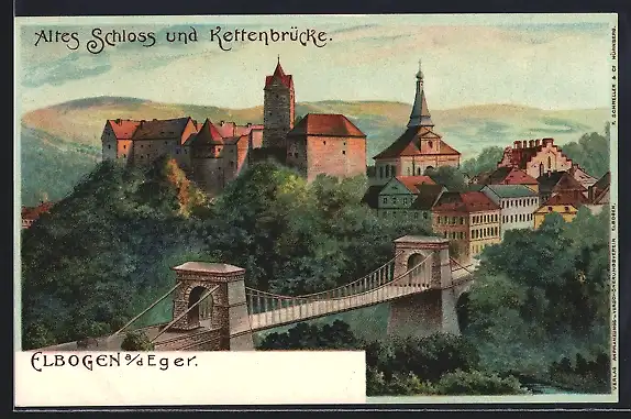 Lithographie Elbogen a. d. Eger, Altes Schloss mit Kettenbrücke