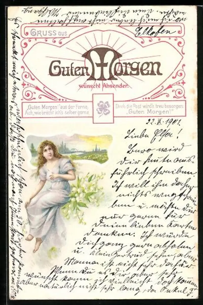 Lithographie Elegante junge Frau mit Maiglöckchen, Jugendstil