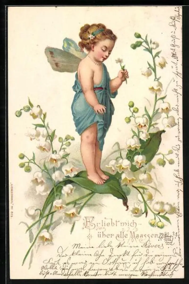 Lithographie Elfe steht auf einem Blatt mit Blume in der Hand, Er liebt mich über alle Maassen