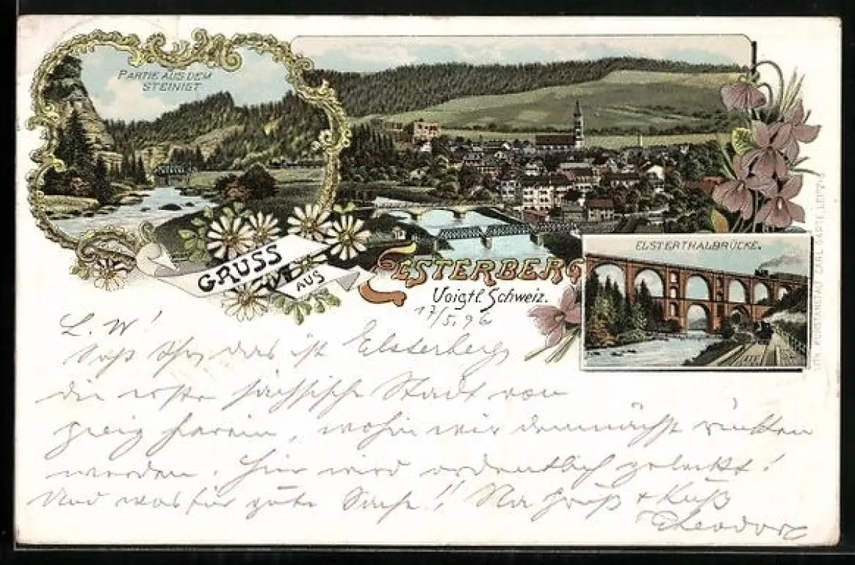 Lithographie Elsterberg / Vogtl., Elsterthalbrücke, Partie aus dem Steinigt, Panorama