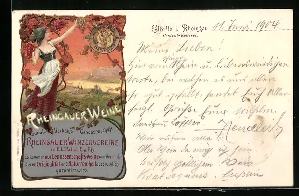 Lithographie Eltville i. Rheingau, Rheingauer Weine, Rheingauer Winzervereine, Frau pflückt Trauben