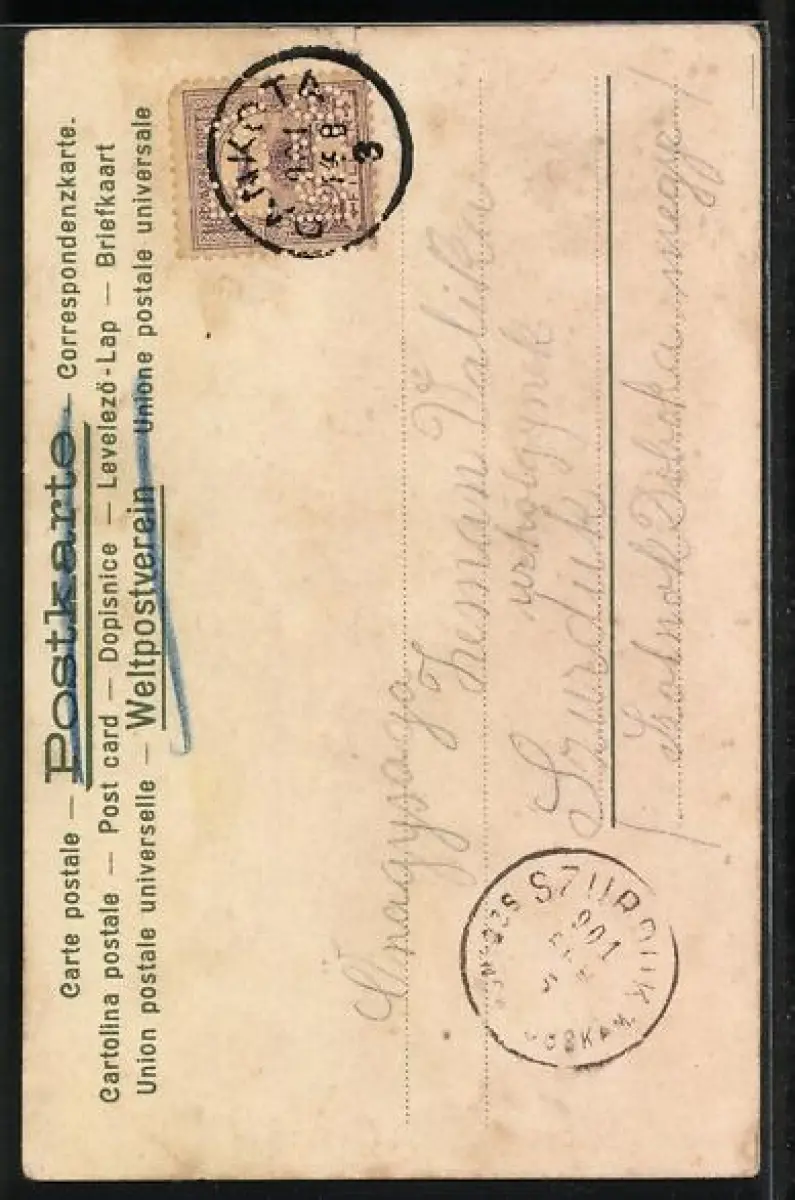 Personenbezogene Daten auf der Rückseite der Karte wurden durch blauen Textmarker unkenntlich gemacht. Die blauen Stellen sind auf die Vorderseite durchgeweicht und wirken sich negativ auf das Postkartenfoto aus