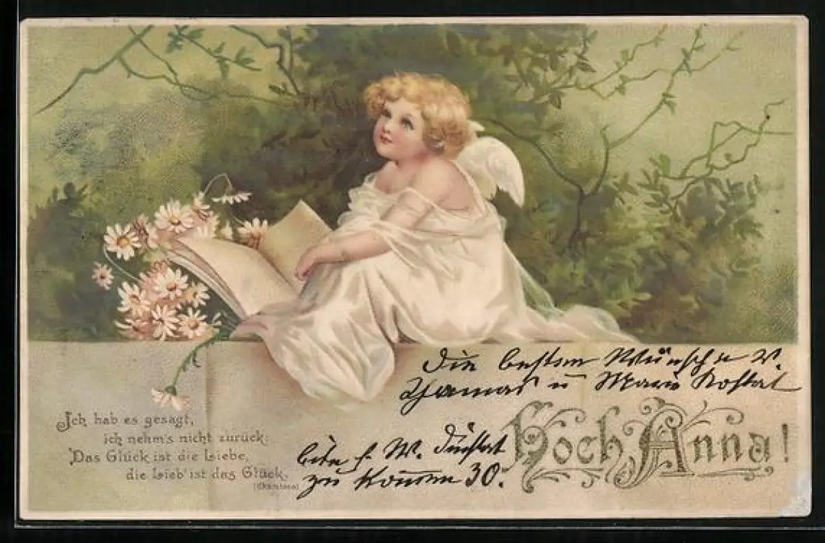 Lithographie Engel sitzt mit einem Buch und Blumen auf einer Mauer, Hoch Anna!, Namenstag