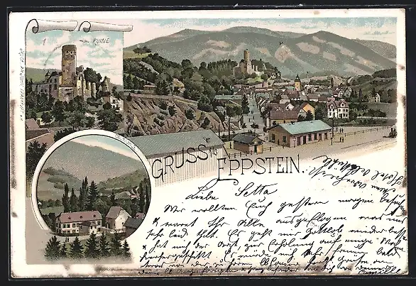 Lithographie Eppstein, Oelmühle, Ruine, Ortsansicht mit Bahnhof