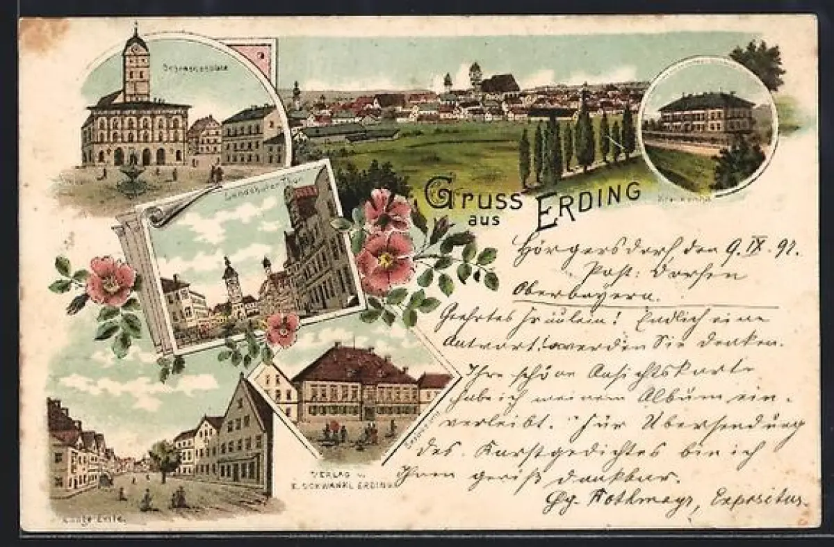 Lithographie Erding, Ortsansicht, Lange Zeile, Bezirksamt, Schrannenplatz