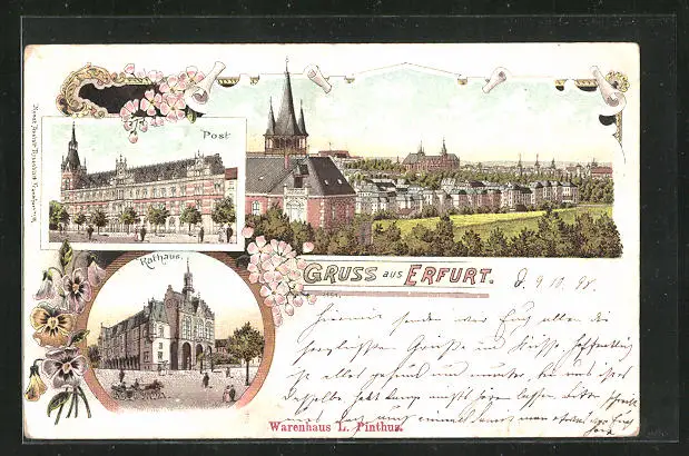 Lithographie Erfurt, Teilansicht, Post, Rathaus