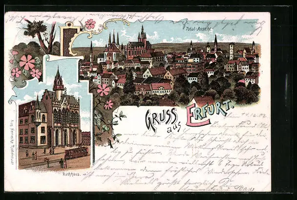 Lithographie Erfurt, Totalansicht mit Rathaus