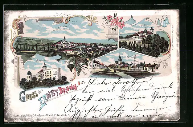 Lithographie Ernstbrunn, Totalansicht, Altes Schloss, Marktplatz und Schloss