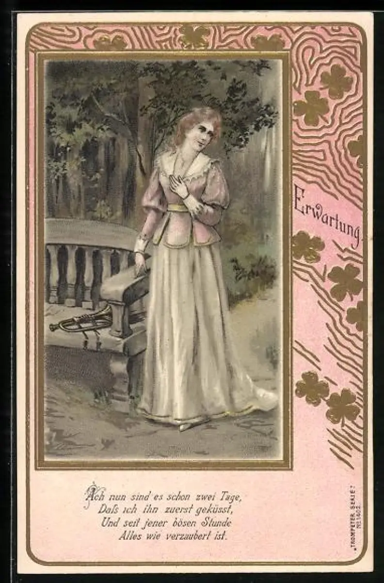 Lithographie Erwartung, Junge Dame neben einer Bank mit Trompete, Trompeter-Serie, Behüt Dich Gott!