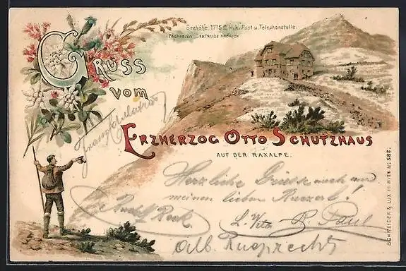 Lithographie Erzherzog Otto-Schutzhaus, Raxalpe, K. k. Post- & Telefonstation