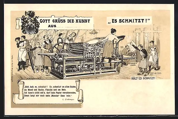 Lithographie Es schmitzt, Arbeiter an einer Papiermaschine