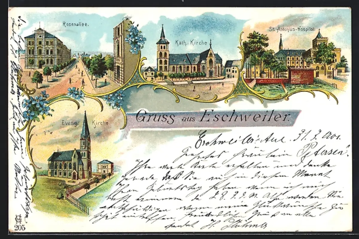 Lithographie Eschweiler, St. Antonius-Hospital, Katholische Kirche, Rosenallee