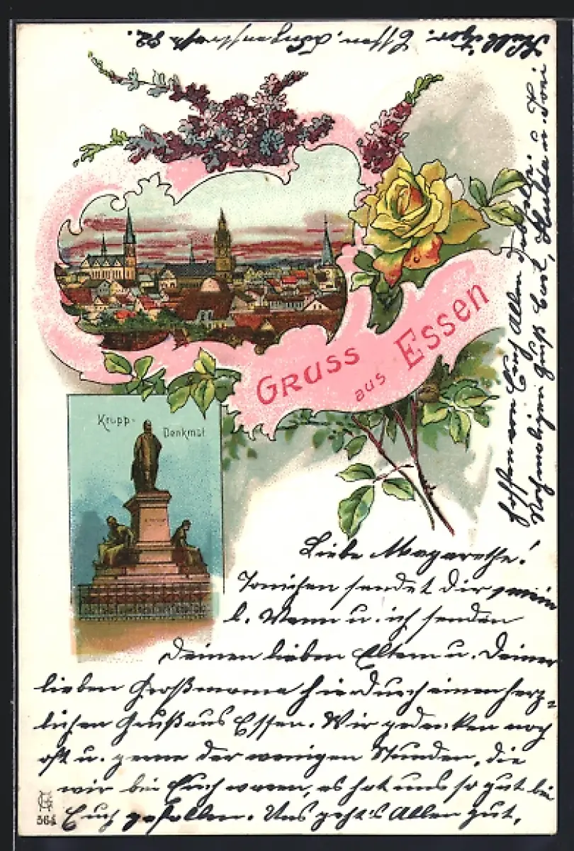 Lithographie Essen, Krupp-Denkmal, Ortsansicht aus der Vogelschau