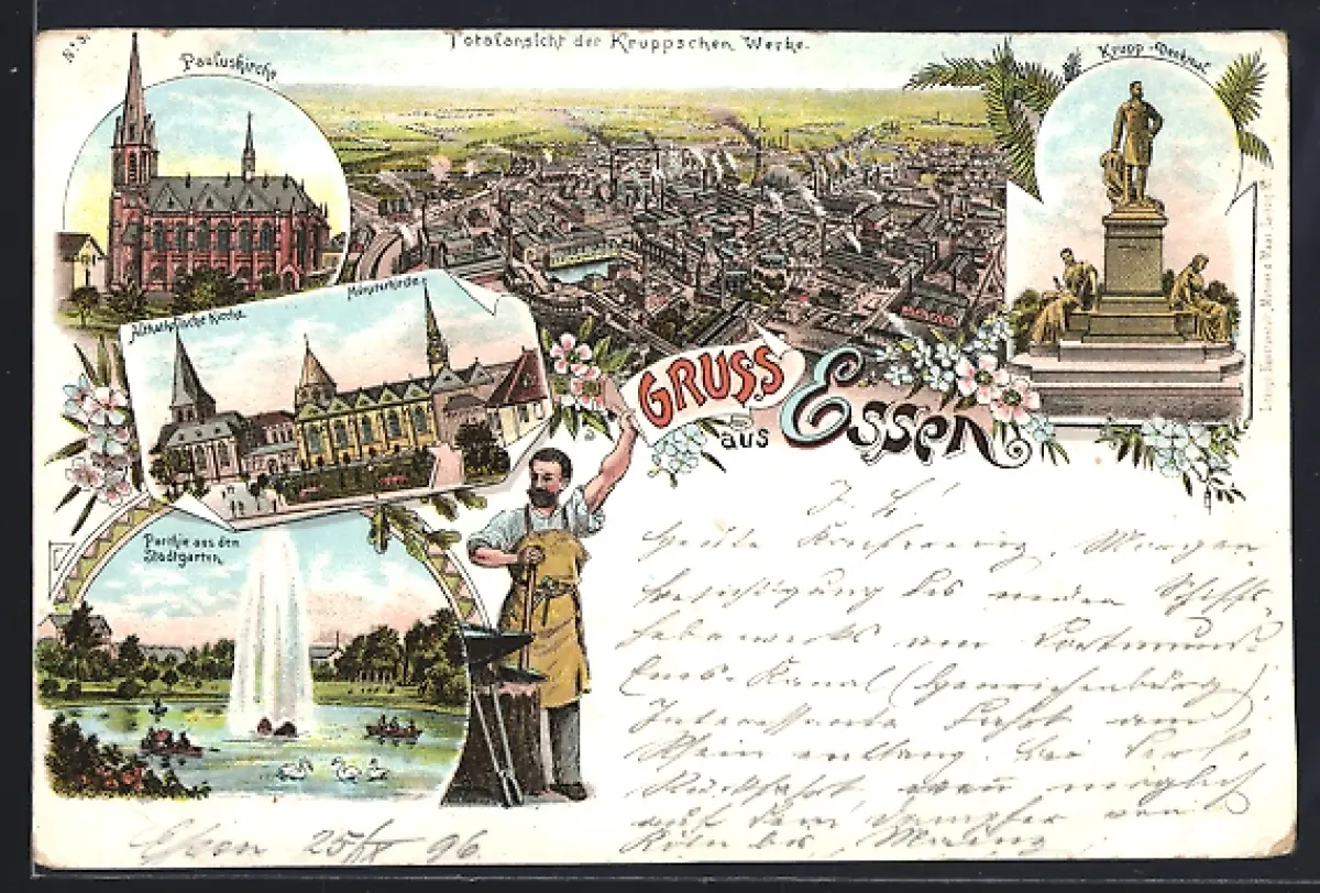 Lithographie Essen, Pauluskirche, Krupp-Denkmal, Ansicht der Kruppschen Werke