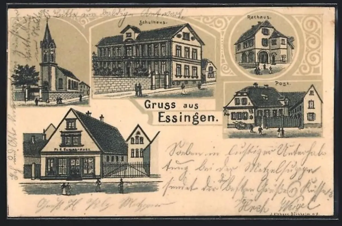 Lithographie Essingen / Pfalz, Kirche, Schule, Rathaus und Post