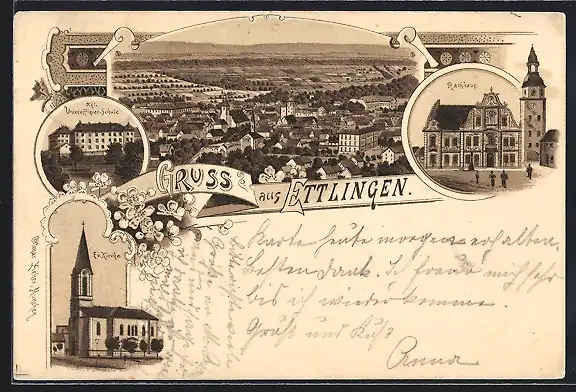 Lithographie Ettlingen, Kgl. Unteroffizier-Schule, Ev. Kirche, Rathaus