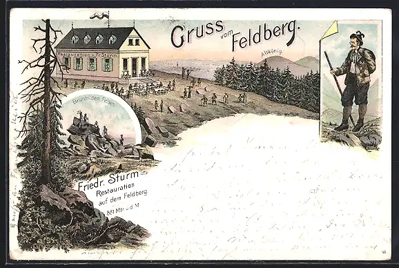 Lithographie Feldberg / Taunus, Restaurant v. Fr. Sturm, Brunhilden Felsen, Altkönig & Wanderer