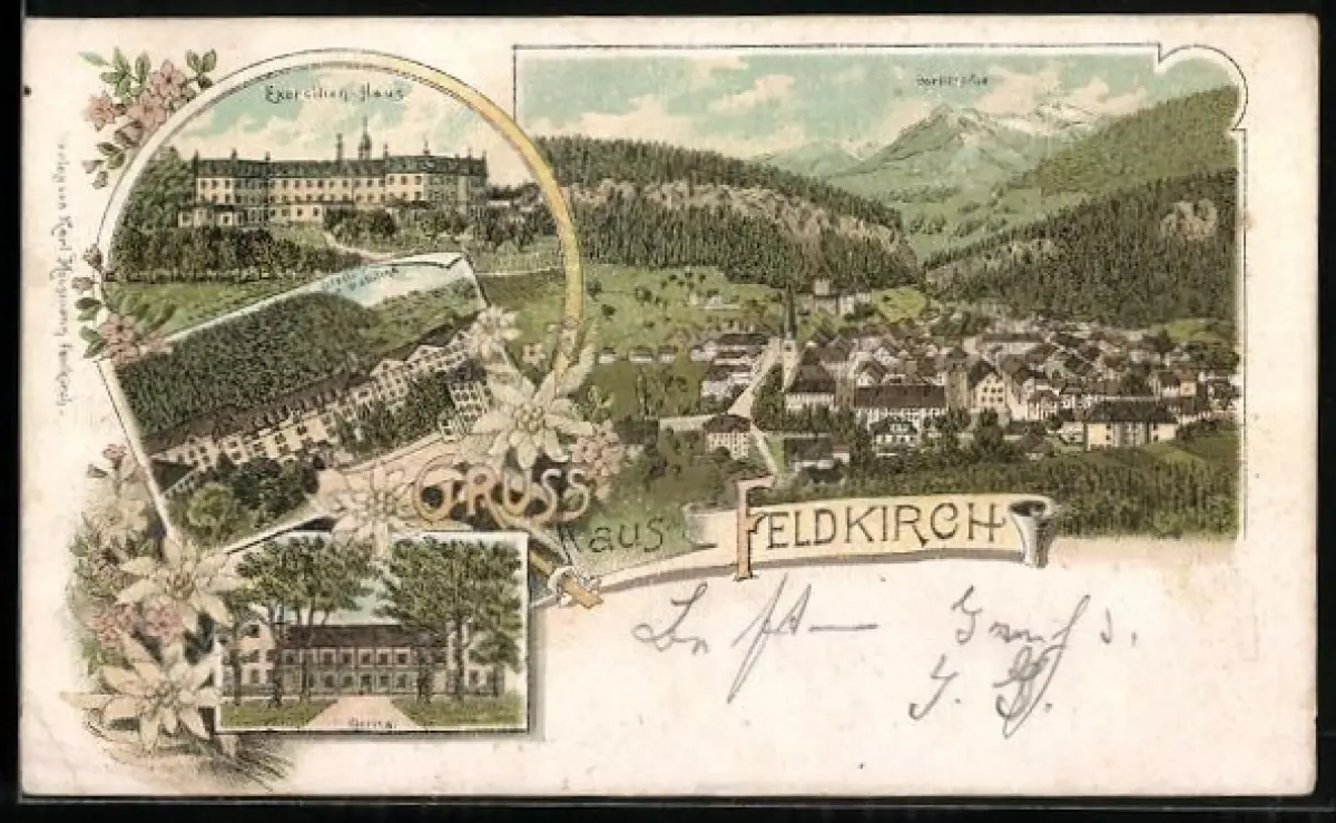 Lithographie Feldkirch, Exercitien-Haus, Ortsansicht mit Gurlisspitze, Stella Matutina