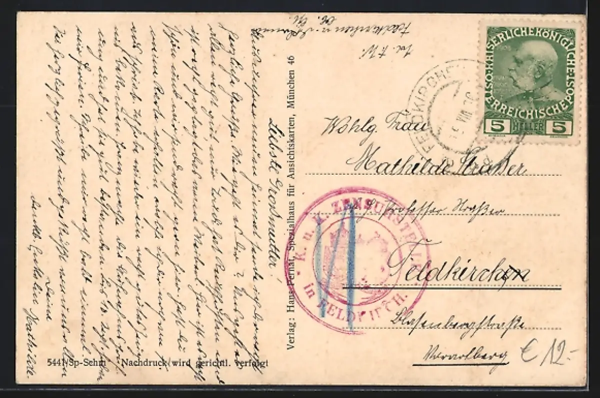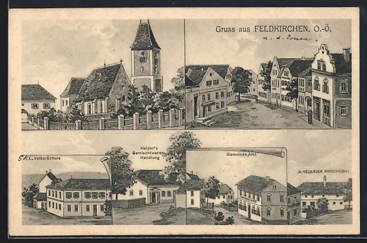 Lithographie Feldkirchen /O.-Ö., Haider`s Gemischwaren-Handlung, Gemeinde Amt, St. Neubauer Hufschmid, Volks-Schule