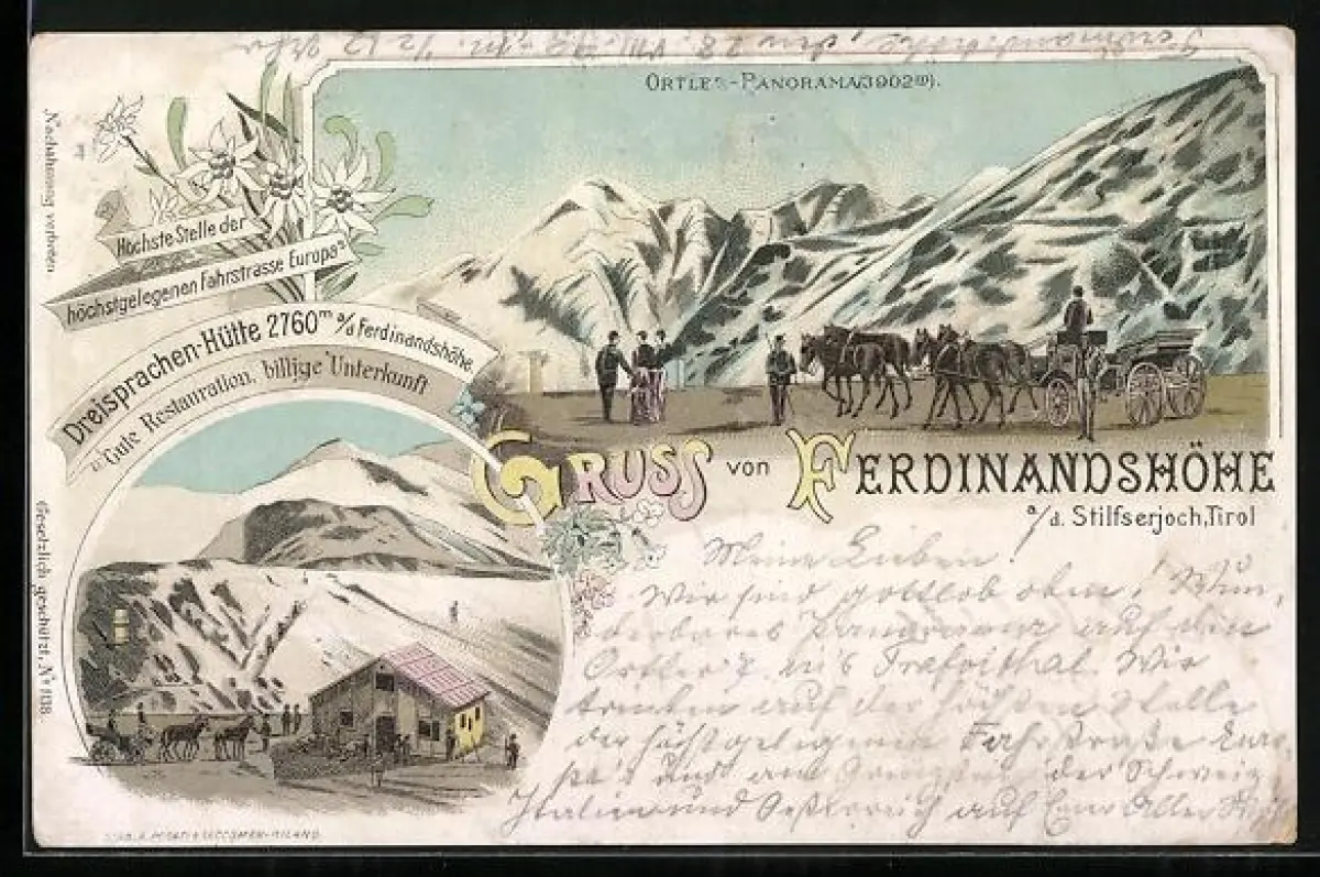 Lithographie Ferdinandshöhe a / d. Stilfserjoch, Ortler Panorama, Dreisprachen-Hütte