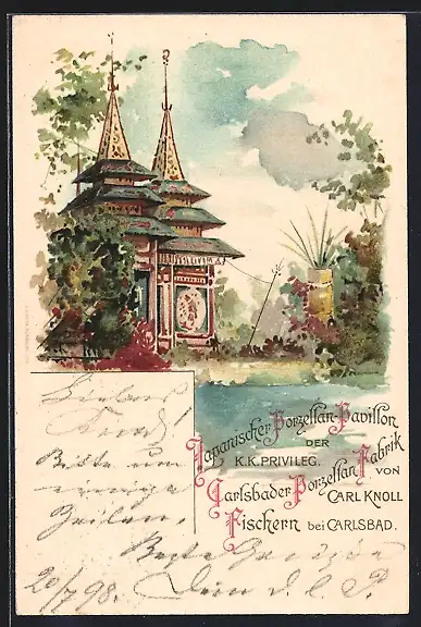 Lithographie Fischern, Japanischer Porzellan-Pavillon d. Carlsbader Porzellan Fabrik v. C. Knoll