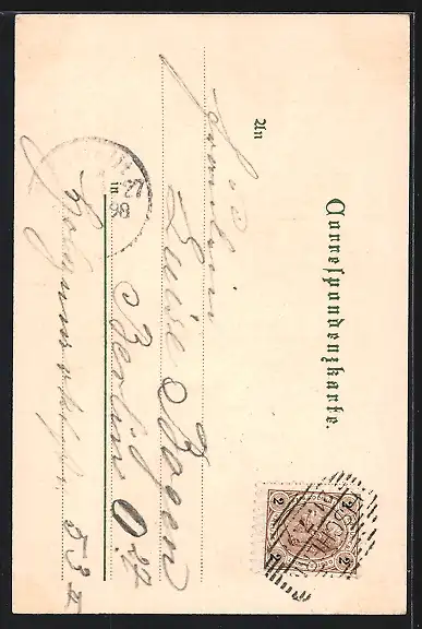 Personenbezogene Daten auf der Rückseite der Karte wurden durch blauen Textmarker unkenntlich gemacht. Die blauen Stellen sind auf die Vorderseite durchgeweicht und wirken sich negativ auf das Postkartenfoto aus