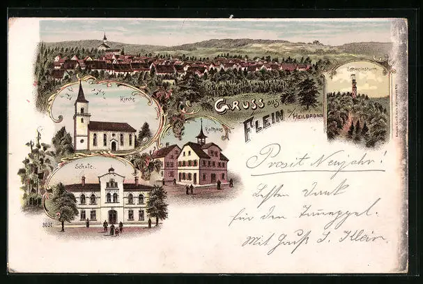 Lithographie Flein / Heilbronn, Kirche, Rathaus, Schule, Schweinsturm, Totalansicht