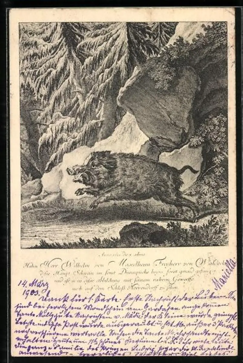 Lithographie Flüchtendes Wildschwein im Wald