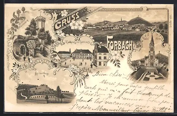 Lithographie Forbach, Marktplatz mit Rathaus, Ruine mit Aussichtsthurm