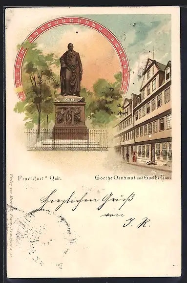 Lithographie Frankfurt, Goethe-Denkmal und Goethehaus