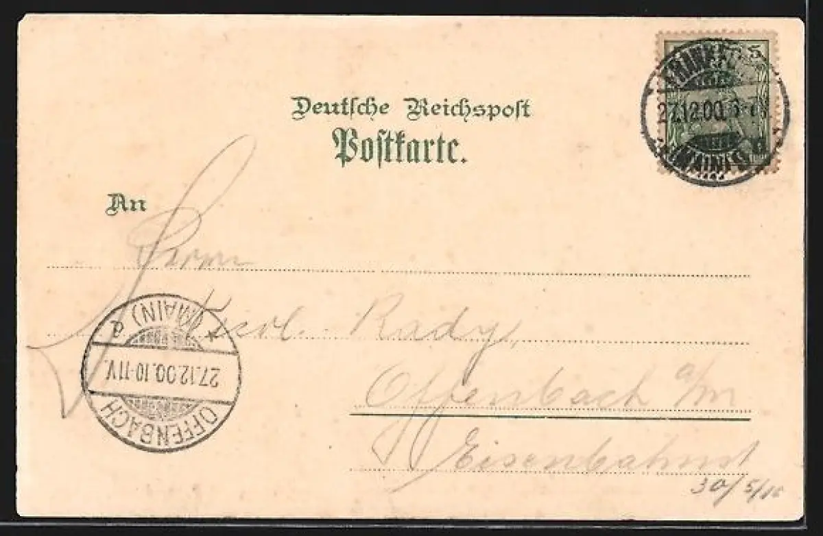 gelaufen 1900, rückseitig Oberflächenschaden, Oberflächenschaden re. oben, Ecken bestoßen, guter Zustand