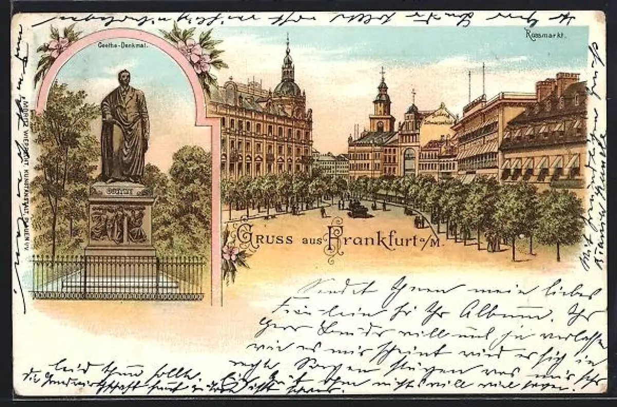 Lithographie Frankfurt /Main, Rossmarkt mit Kutsche, Goethe-Denkmal