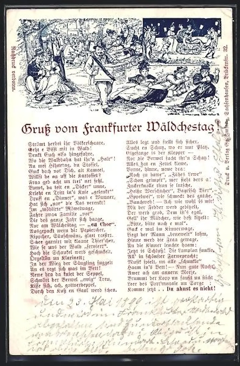 Lithographie Frankfurt-Niederrad, Frankfurter Wäldchestag, Leierkastenmann und Feiernde
