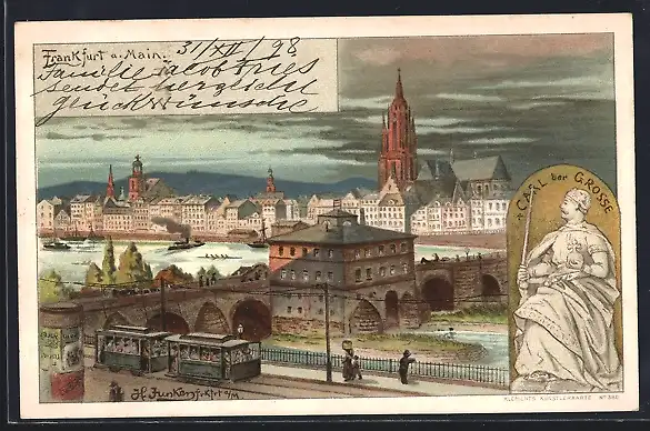Lithographie Frankfurt, Ortsansicht mit Strassenbahn, Carl der Grosse