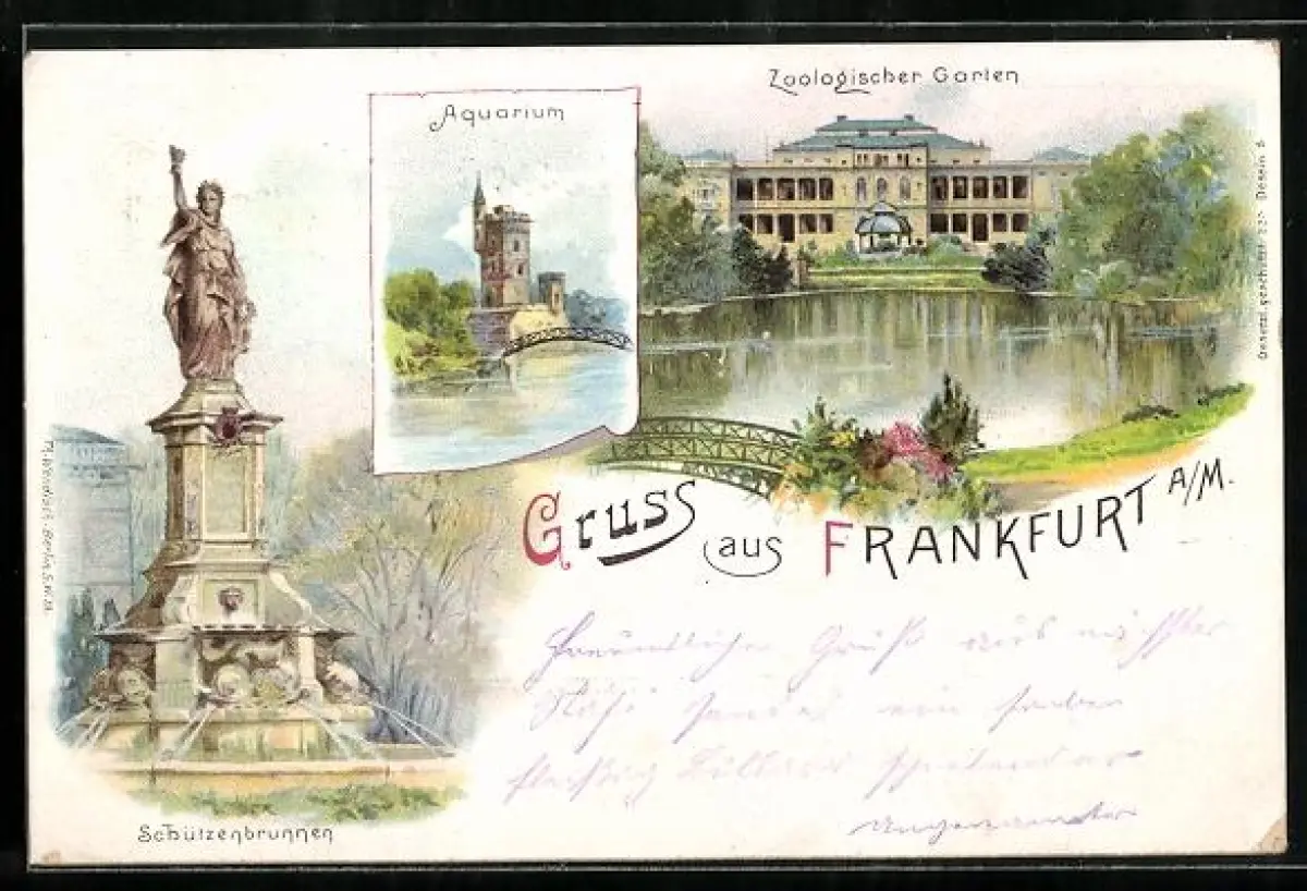 Lithographie Frankfurt-Ostend, Zoologischer Garten, Ruine mit Weiher und Schützenbrunnen