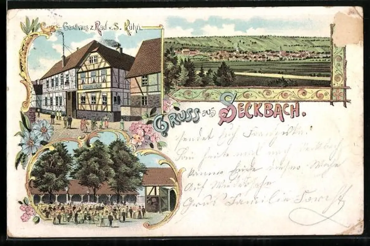 Lithographie Frankfurt-Seckbach, Gasthaus z. Rad v. S. Kühn, Ortsansicht mit Feldern