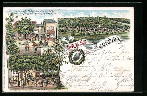 Lithographie Frankfurt-Seckbach, Gasthaus zur neuen Anlage, Ortsansicht