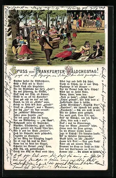 Lithographie Frankfurt, Volksfest Wäldchestag, Festwiese mit verliebten Paaren, Leierkastenspieler