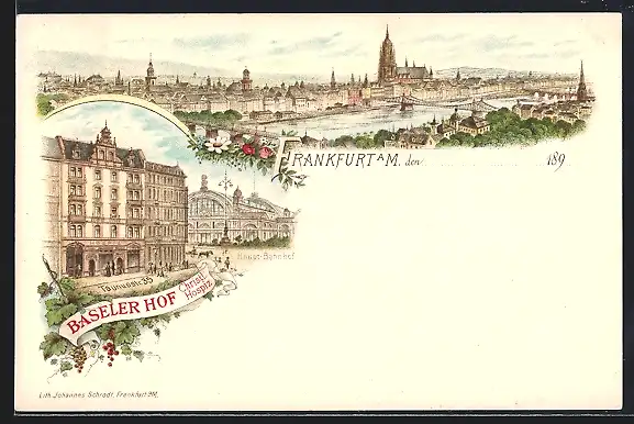 Lithographie Frankfurt a. M., Christliches Hospiz Baseler Hof, Taunusstr. 35, Teilansicht mit Kirche