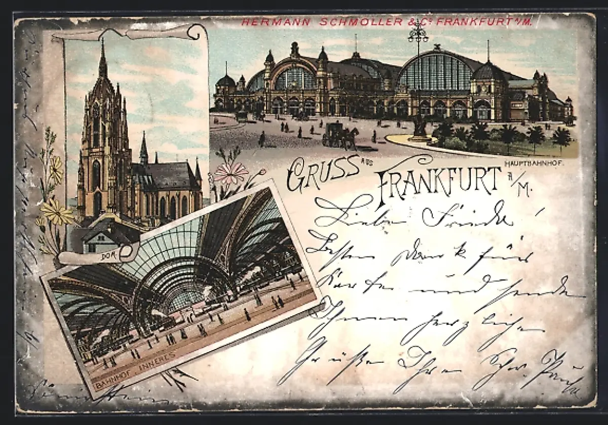 Lithographie Frankfurt a. M., Hauptbahnhof, Dom, Bahnhof Innenansicht