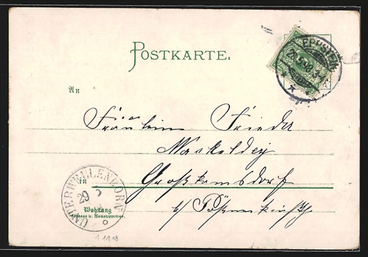 Personenbezogene Daten auf der Rückseite der Karte wurden durch blauen Textmarker unkenntlich gemacht. Die blauen Stellen sind auf die Vorderseite durchgeweicht und wirken sich negativ auf das Postkartenfoto aus