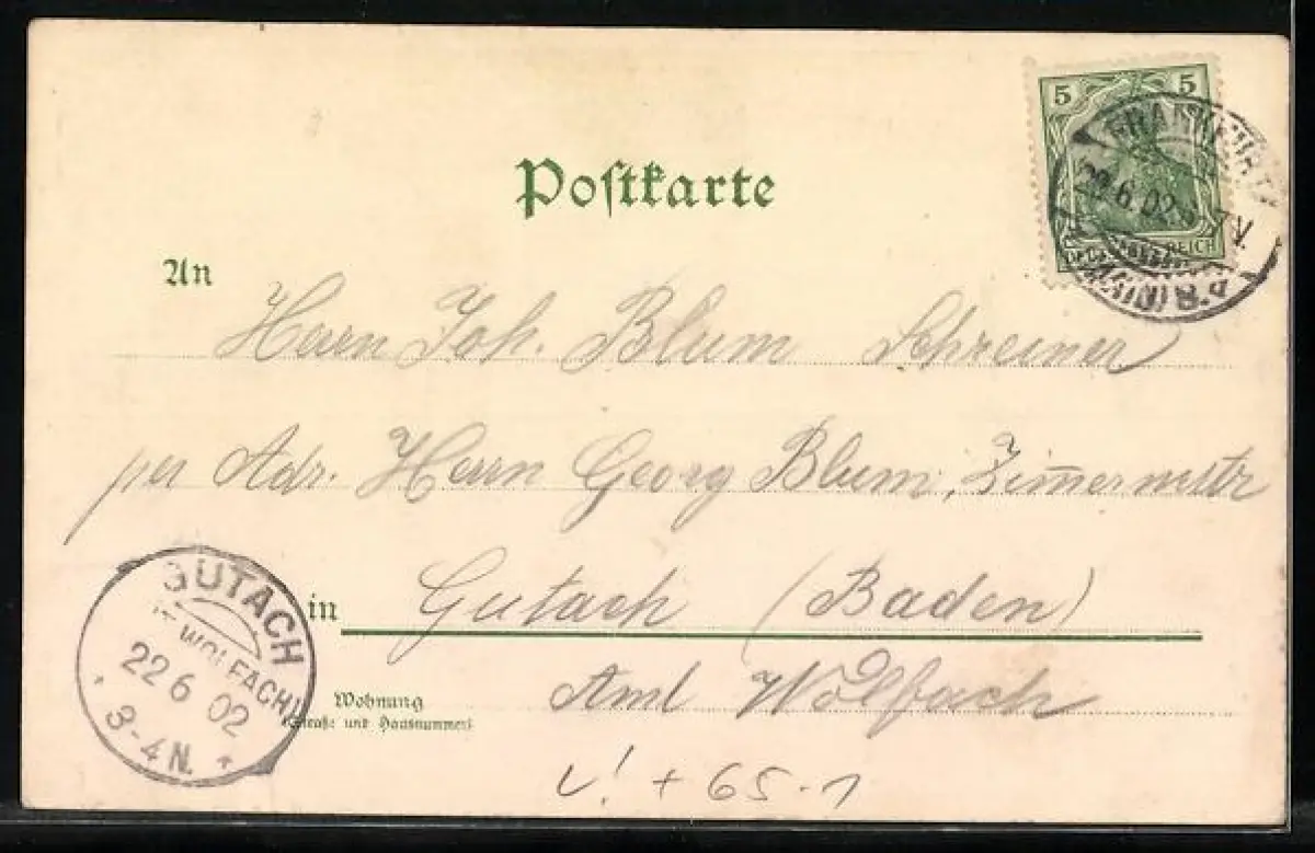 Personenbezogene Daten auf der Rückseite der Karte wurden durch blauen Textmarker unkenntlich gemacht. Die blauen Stellen sind auf die Vorderseite durchgeweicht und wirken sich negativ auf das Postkartenfoto aus