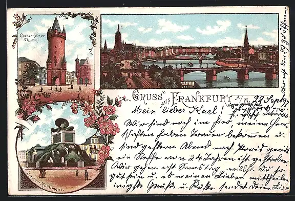 Lithographie Frankfurt a. M., Hessen-Monument, Teilansicht mit Brücken