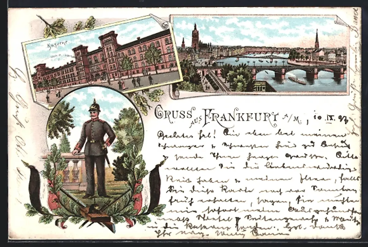 Lithographie Frankfurt a. M., Kaserne, Mainbrücke, Stadtpanorama