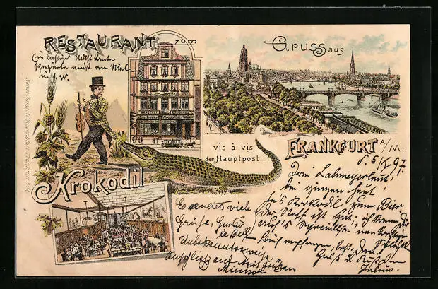 Lithographie Frankfurt a. M., Restaurant zum Krokodil, Geiger mit zuschnappendem Krokodil, Ortsansicht