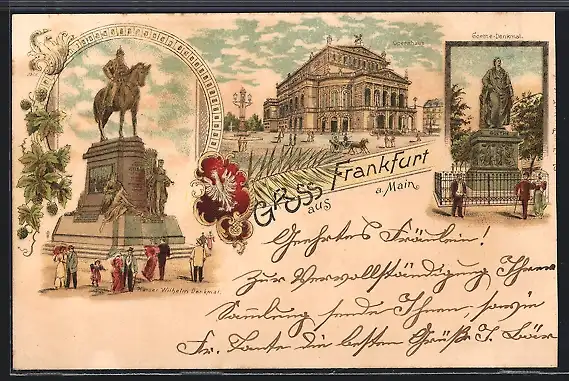 Lithographie Frankfurt a. Main, Goethe-Denkmal, Kaiser Wilhelm Denkmal, Opernhaus
