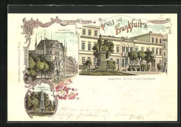Lithographie Frankfurt a. O., Commandantur mit Prinz Friedrich Carl-Denkmal, Kaserne des Leib-Grenadier-Regiments