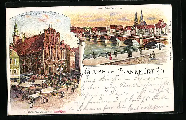 Lithographie Frankfurt a. O., Marktplatz und Rathaus, Neue Oderbrücke