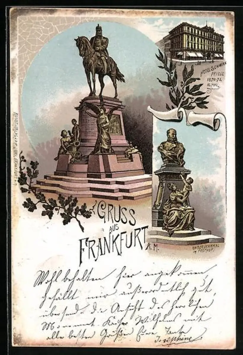 Lithographie Frankfurt am Main, Hotel Schwan, Kaiserdenkmal im Posthof